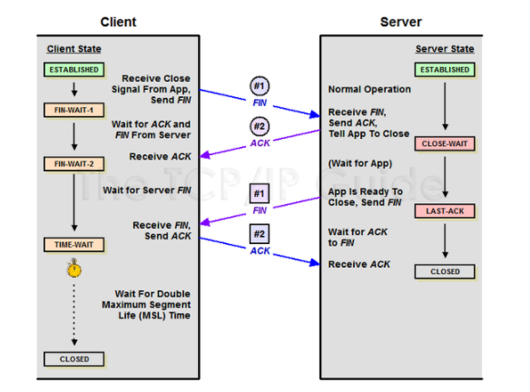 - 서버는 종료 요청 메시지에 대한 ACK응답을 보낸다. 그리고 자신의 통신을 마무리할 때까지 기다린다.