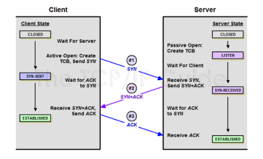 - 클라이언트는 서버 측의 (SYN/ACK) 응답을 대시하는 "SYN-SENT"상태가 된다.